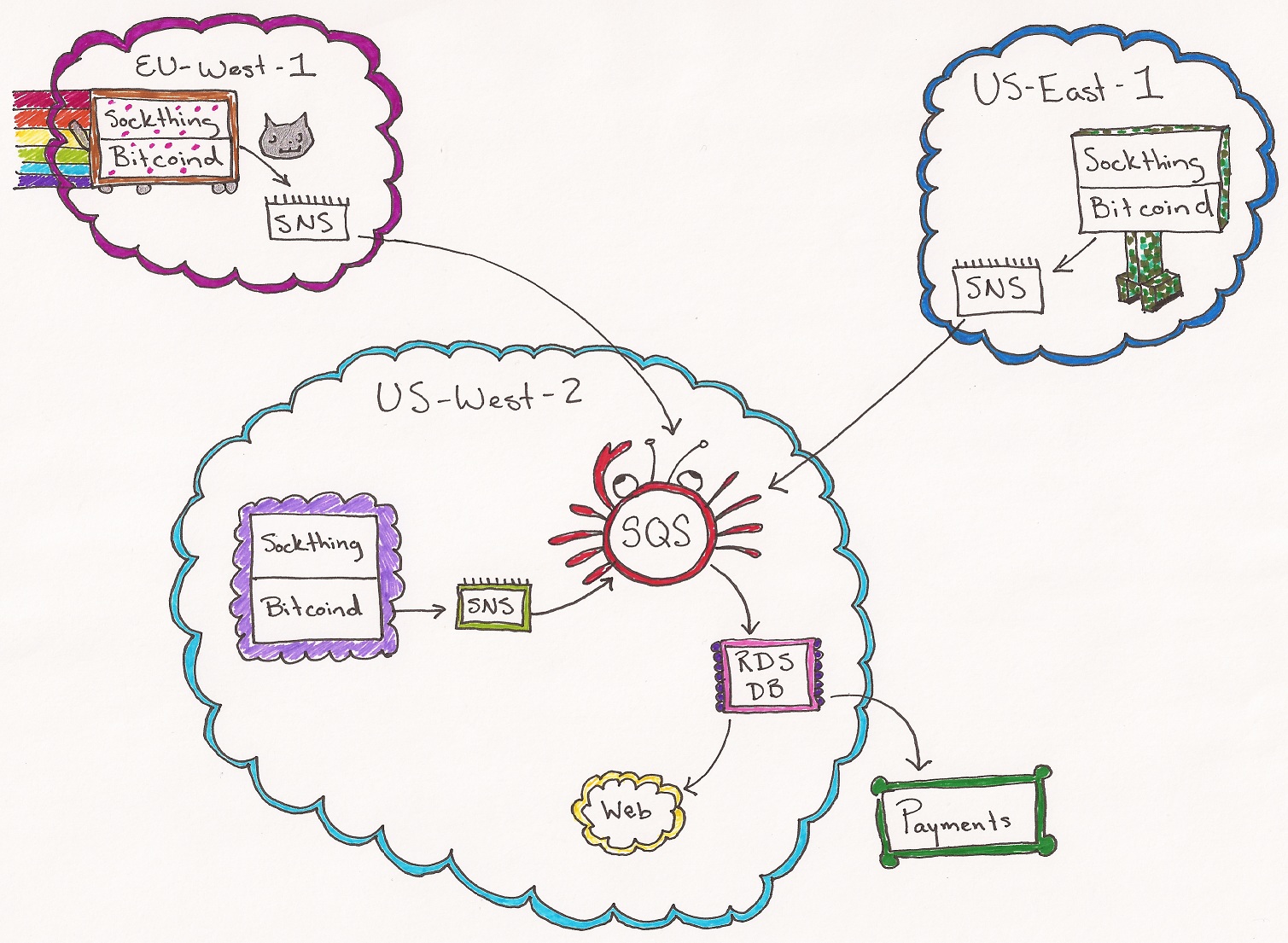 Each HHTT endpoint has its own instance of bitcoind and SockThing. Those two can give out work and generate blocks without anything outside of the bitcoin network itself. To save user shares, SockThing sends the share records to Amazon SNS in the local region. Amazon SNS then is responsible for getting the message to Amazon SQS in us-west-2. SNS will retry until it works if there are problems. Then the share records are read from SQS and processed into an RDS Database. The database provides information for the web page and payment generation.